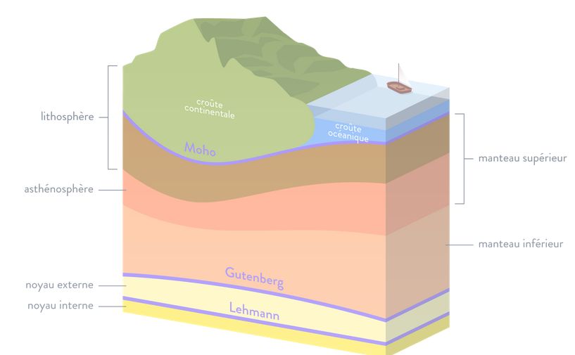 Moho : discontinuité de Mohorovičić, séparation entre la croûte et le manteau